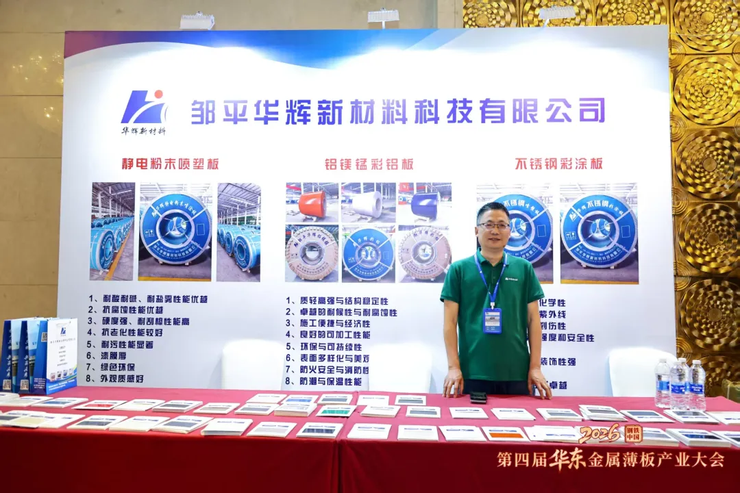 2026 年 4 月 8 日,2026 年第四届华东金属薄板产业大会在万众期待中圆满落幕。邹平华辉新材料科技有限公司携静电粉末喷塑板、铝镁锰彩铝板、不锈钢彩涂板等核心产品及技术方案惊艳亮相,以硬核品质与创新理念,与行业同仁共赴这场薄板产业的年度盛宴,共话绿色转型新机遇邹平华辉新材料科技有限公司。