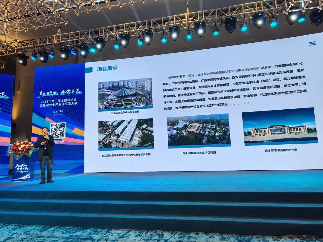 2026 年 4 月 10 日,2026年第二届彩涂板绿色涂装全产业链大会在博兴圆满举办。作为绿色涂层金属板材转型升级的探索者,邹平华辉新材料科技有限公司受邀出席盛会,公司董事长陶仁辉登台发表主题演讲,分享华辉在绿色涂装、产品升级、产业转型中的实践成果与发展理念,与行业同仁共探绿色发展新路径。