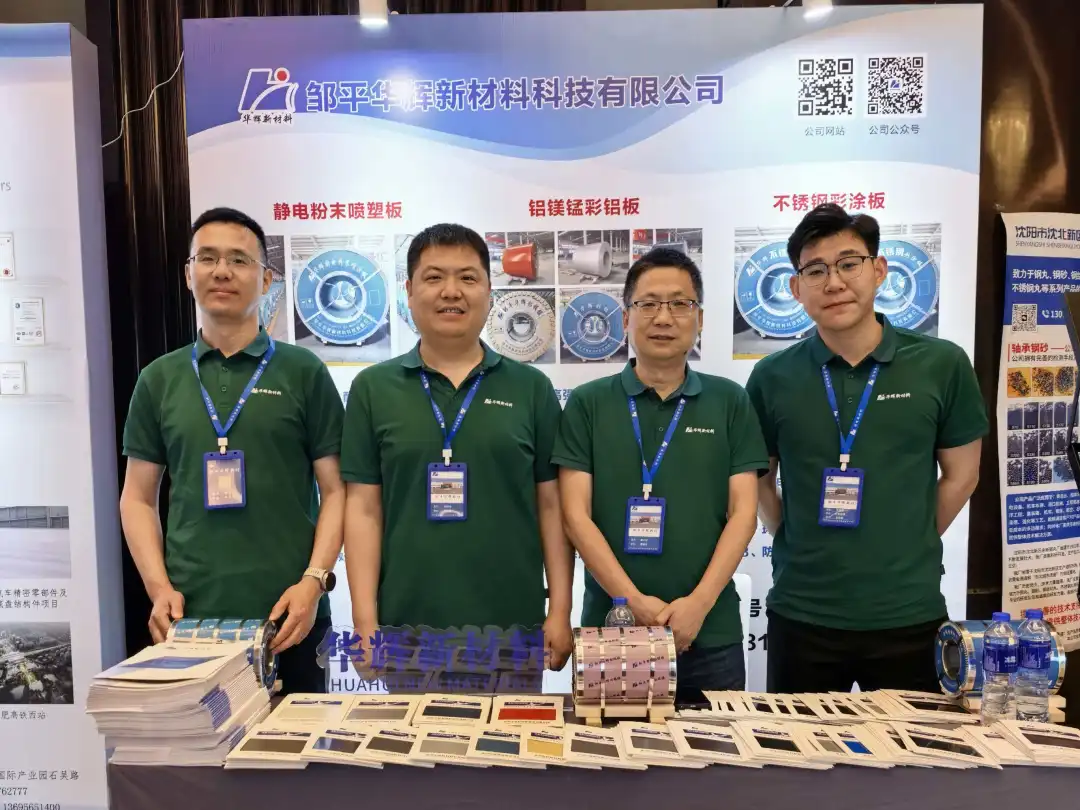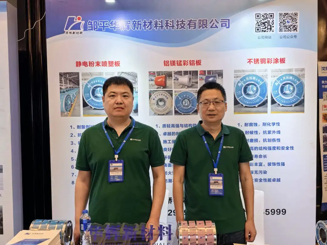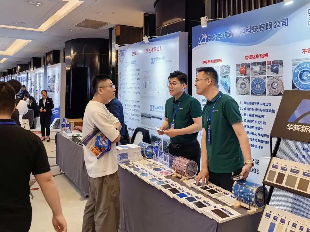 展会现场人流络绎不绝,邹平华辉新材料展台布局整洁大气,集中展示企业主营产品:静电粉末喷塑板【喷涂】、铝镁锰彩铝板、不锈钢彩涂板【辊涂】等核心产品,适配高铁站房、文旅建筑、工业厂房、养殖配套建筑等多场景工程应用。